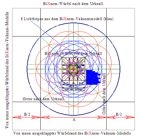 Der BiXnom entstand bei noch dünnem Wissensgehalt als "Erkenntniswürfel". Hier fällt aber durchaus etwas ab, und zwar die Lichtgeschwindigkeit mit unendlicher Genauigkeit: Das Ur-Universum ist mit wenigen Kreisen darzustellen. Als Unbekannte X ist die Größe der Lichtkugel einzuführen, die 1x in der Linse liegt und 1x auf einem Kreisschnittpunkt der Struktur, um dort den Lichtkreisradius zu bilden. Die Mathematik hat zwar keinen Beitrag zur Würfelkunde geliefert, lässt nunmehr aber aus dem Nichts heraus auf wundersame Art einen 9-feldrigen-Würfel erscheinen, der über ein BiXnom-Gitter verfügt. Der Lichtkreis schneidet den Gitterschnittpunkt soweit zeichnerisch erkennbar absolut exakt. Mit der iterativ ermittelbaren Lichtkugelgröße ergibt sich nunmehr die Lichtgeschwindigkeit, wenn vom Modellradius der Radius der Lichtkugel subtrahiert wird.