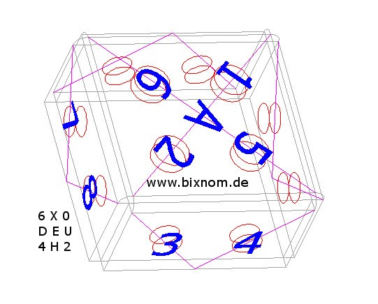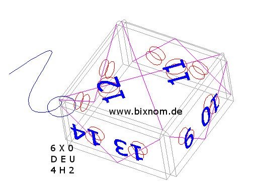 Die beiden Schnurenden vom Inneren des Mutterteils werden übernommen. Im Vaterteil geht es aus dem Loch 9 nach außen. Nun geht es von außen auf das Mutterteil durch die Schlaufe und zurück über das Vaterteil über Loch 10 nach innen. Die Flechtkreuze " x " für die Zahlensymbole werden so geschaffen. Durch Loch 11 wieder heraus. Dort kommt nun auch zugleich das andere Schnurende heraus. Mutter- und Vaterteil hängen nun mit einem muschelartigen Gelenk zusammen. Zwischen Nr 11 und 12 ist nunmehr das Zahlensymbol " / " für die Seite 1 als Doppelstrich zu sehen. Es gibt auch die Alternative, dass man zum Schluss innen im Würfel einen Knoten setzt und von dem Doppelstrich einen als Henkel zum Schnurspannen hochzieht. Der Würfel hängt dann horizontal statt über Eck. Um den Würfel als Schauobjekt zu präsentieren, sind die beiden Senkelenden mit einem Endknoten als Aufhänger zu verbinden.